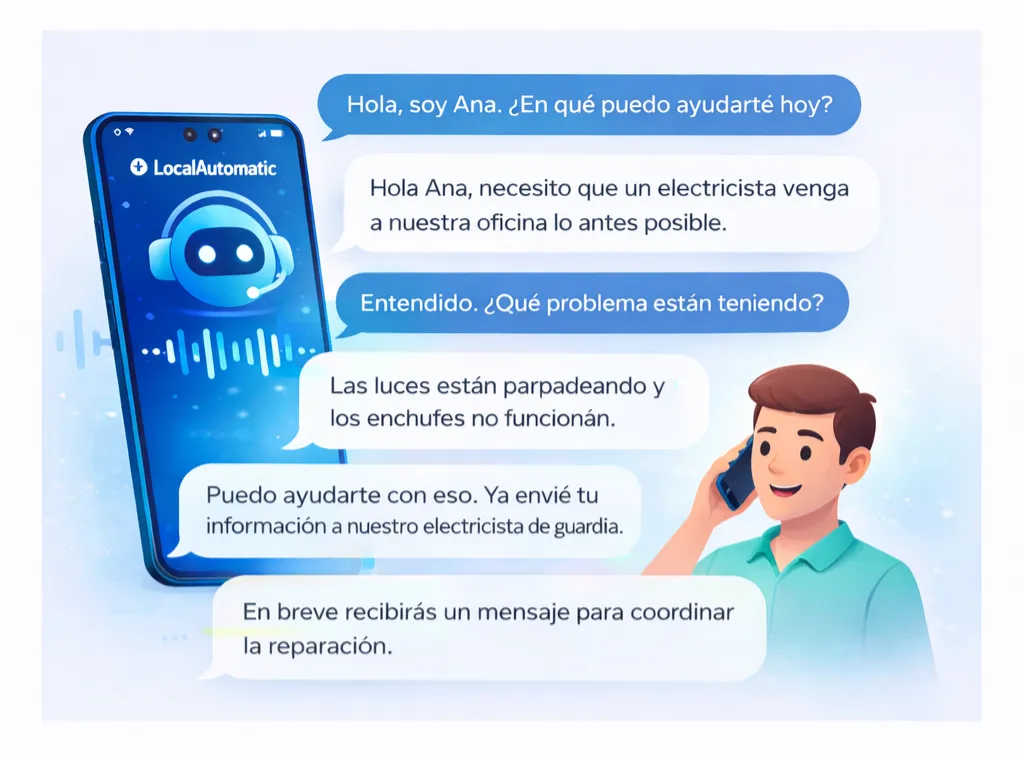 Cualquier negocio local que viva de llamadas entrantes: fontaneros, electricistas, abogados, clínicas, talleres, inmobiliarias, peluquerías, academias... Si una llamada perdida te cuesta dinero, Local Automatic se paga solo.